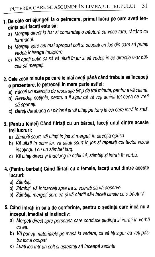 | Limbajul trupului este lectura care vă va ajuta să obțineți ceea ce vă doriți de la ceilalți, înțelegând totodată mesajele nonverbale pe care interlocutorii vi le transmit. După ce veți descifra înțelesul ascuns aflat în spatele anumitor gesturi, grimase sau mișcări ale corpului, veți căpăta un adevărat al șaselea simț, care vă poate schimba viața, salva cariera sau vă poate ajuta în orice moment dificil. |