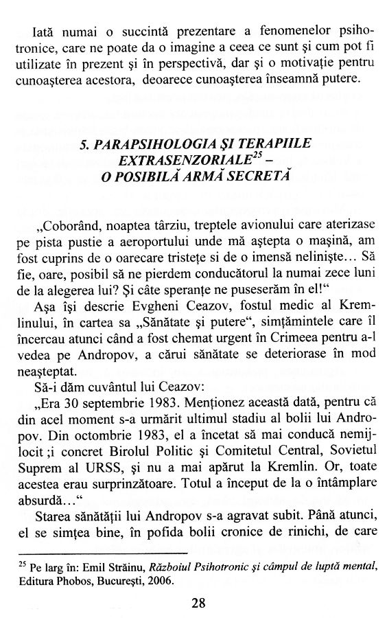 | Cartea de față reprezintă un eveniment unic, de excepție în mass-media românească. Autorul prezintă în premieră și cu lux de amănunte o adevărată lecție referitoare la ceea ce înseamnă azi Parapsihologia și modul ei de folosire în serviciile secrete atât în perioada de dinainte de 1990 cât și mai ales pentru astazi (vezi cazul Flacăra Violetă sau Cazul Răpirea din Irak) și viitor. |