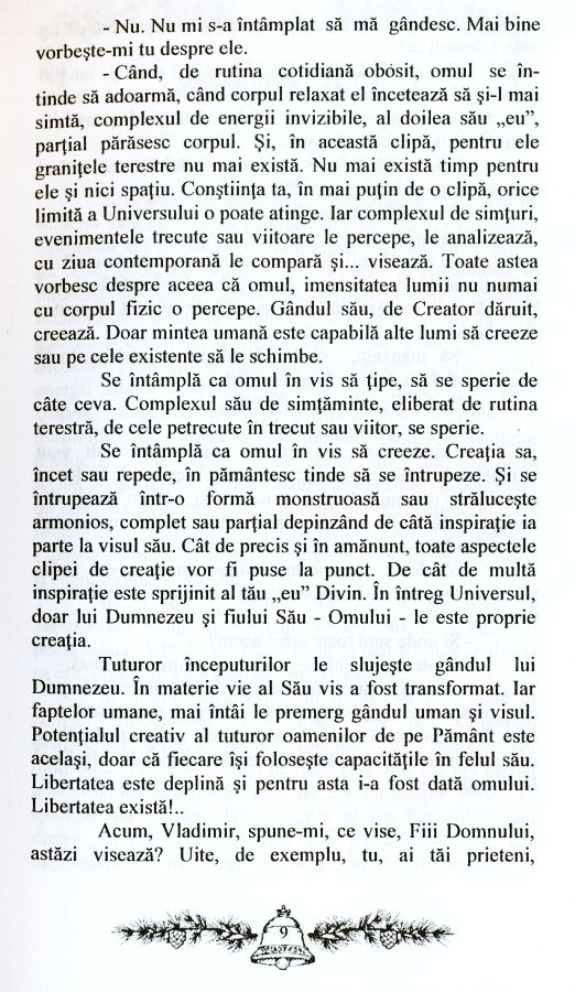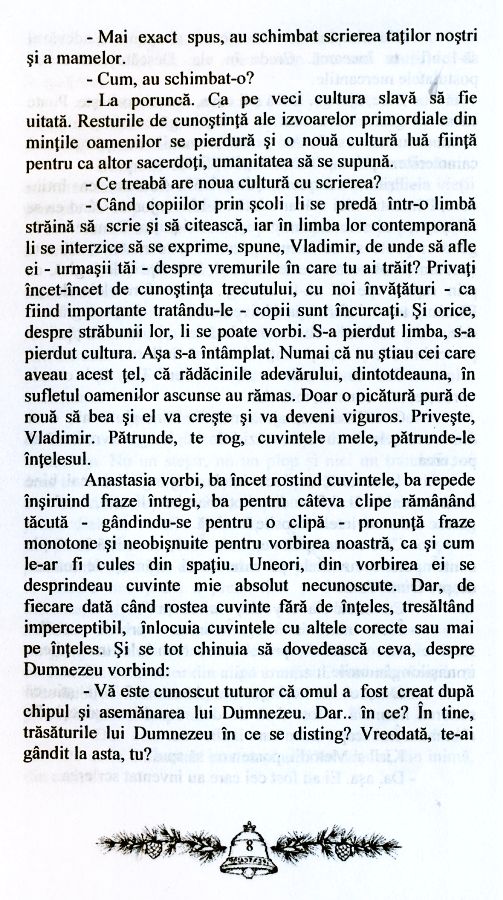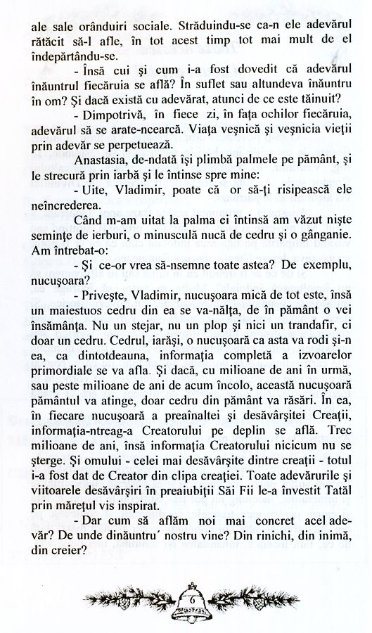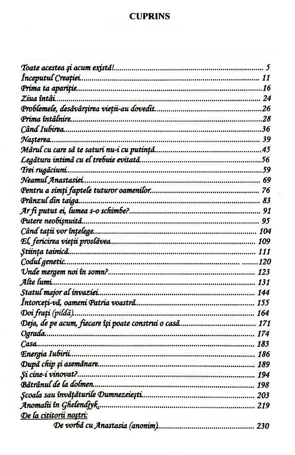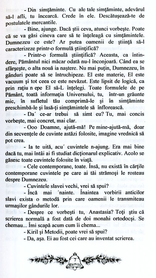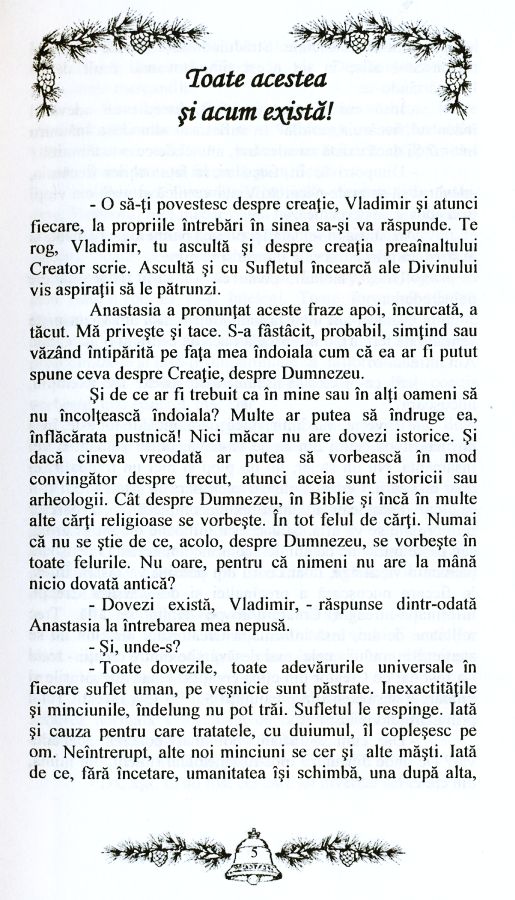 | Modul transparent și coerent în care Megre (mai bine spus Anastasia) descrie „Big Bang-ul″ taie respirația... Nu dogmatic, nu stereotipic, ci logic, atât cât logica își poate aduce aportul în descrierea unor fapte atât de cruciale pentru existența umană. Nu ne rămâne decât să vă invităm s-o citiți. |