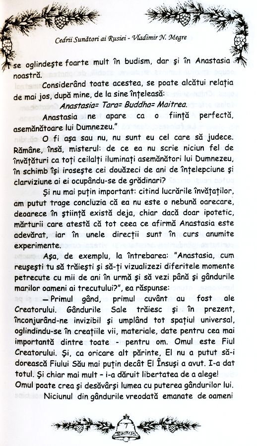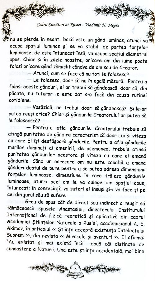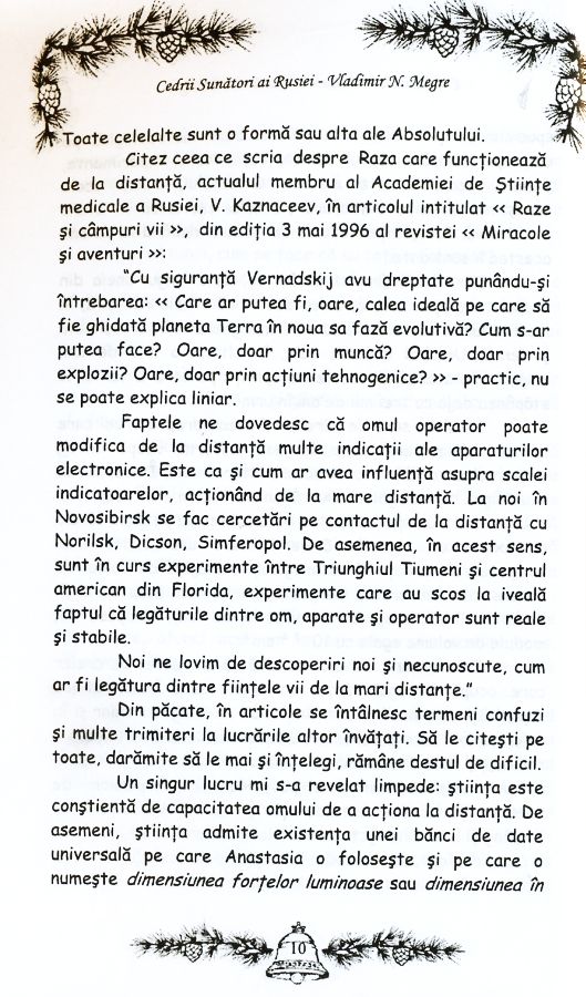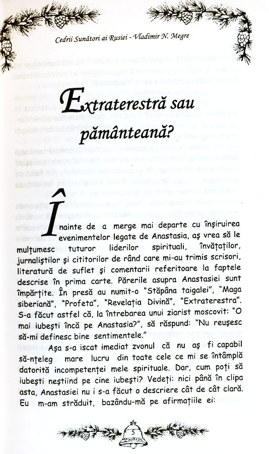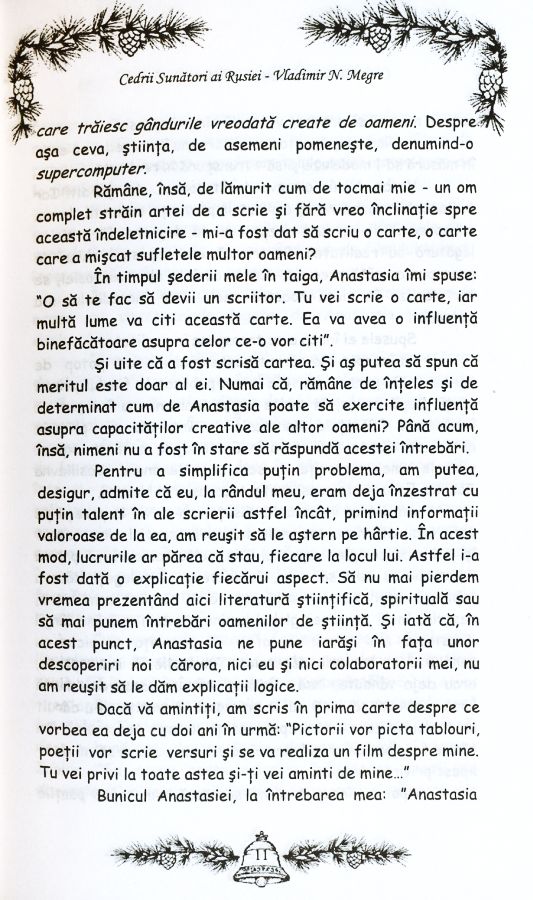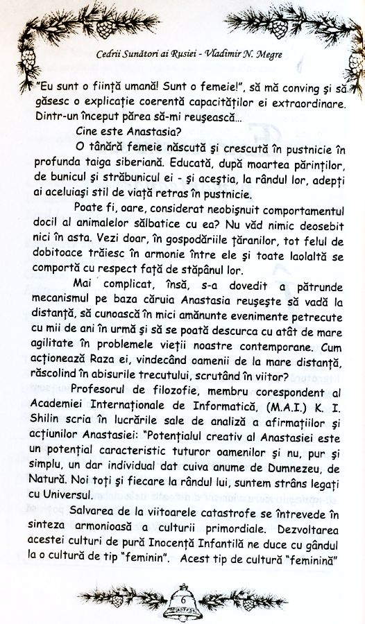 Imboldit de promisiunea făcută Anastasiei de a institui o asociație a oamenilor de afaceri ruși cu intenții curate și de a scrie o carte despre cele trăite și învățate în taiga, Megre este prins în vârtejul evenimentelor care îl poartă chiar în pragul sinuciderii, lăsându-l să creadă ca aceasta ar rămâne calea din urmă pentru a ieși din înfundătura în care se găsea: a lăsat și a fost lăsat de familie, de prieteni și colaboratori, s-a făcut responsabil de falimentul societăților pe care le conducea, lăsând pe drumuri astfel multe persoane care credeau în virtuțile lui de afacerist. Reușește în cele din urmă, ajutat de mai multe persoane care-l vor înconjura în mod misterios cu înțelegere și pasiune, să scrie prima cărticică, subțirică la  început și fără pretenții artistice și să vândă toate exemplarele primului mic  tiraj.