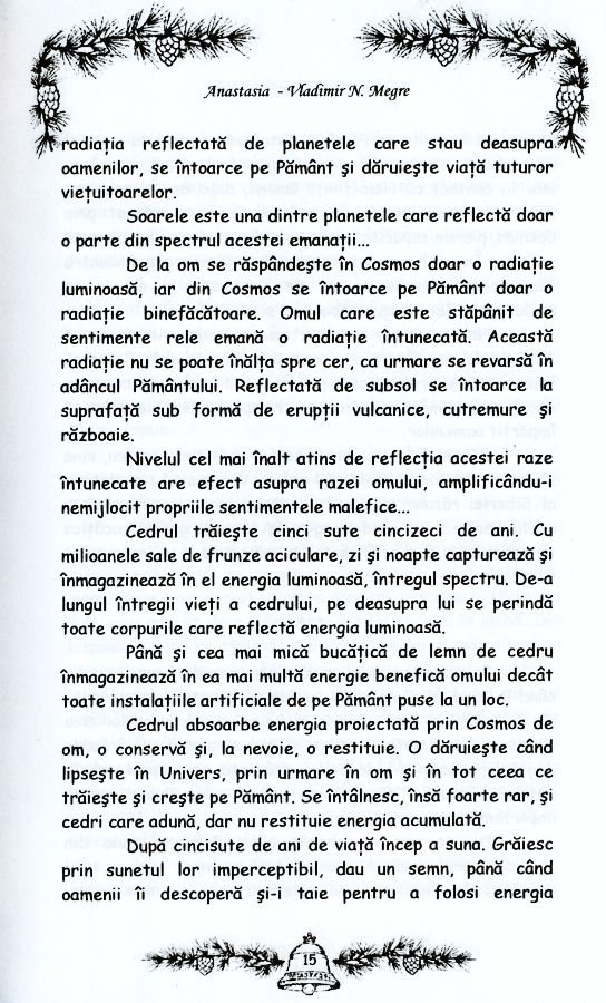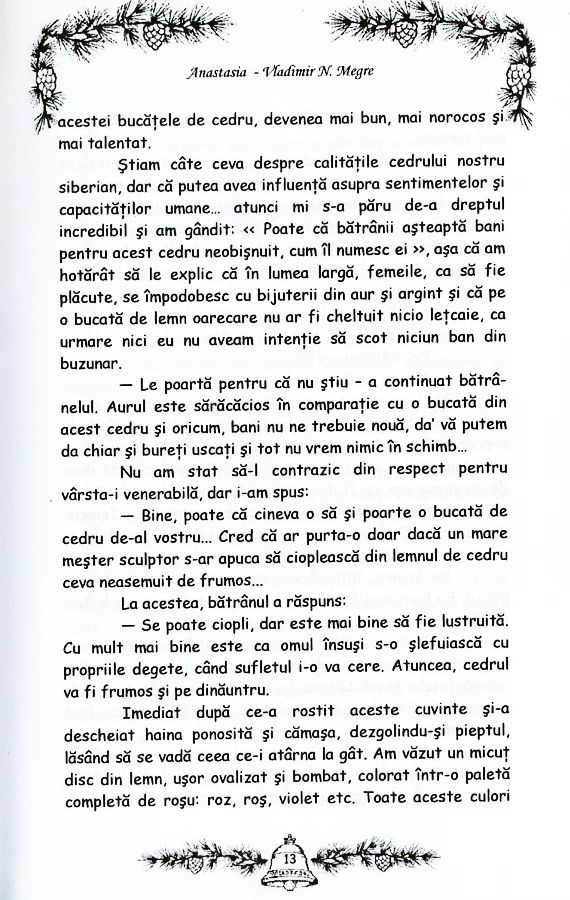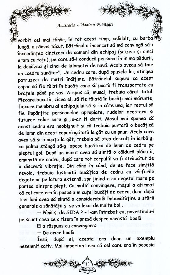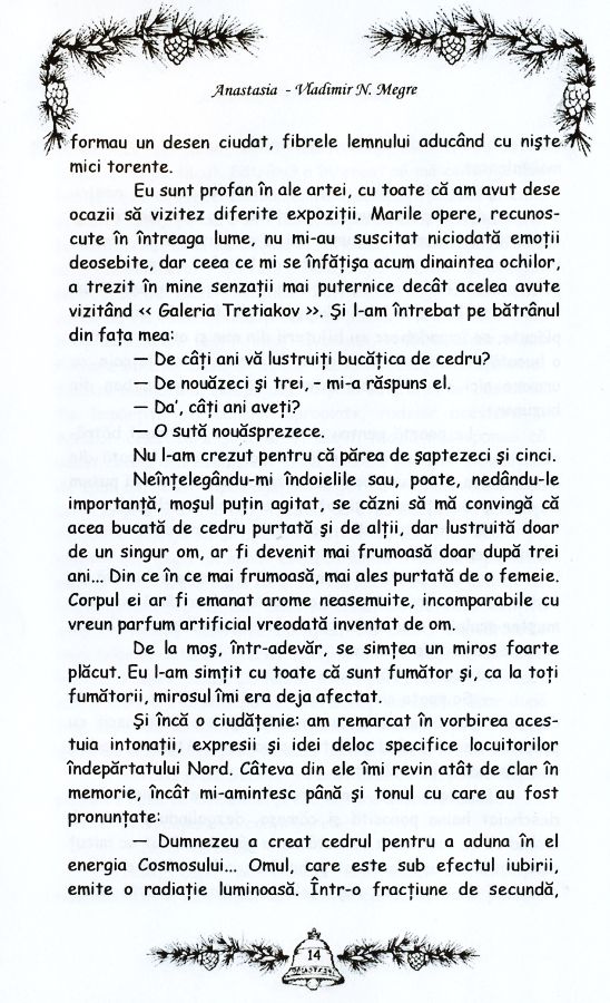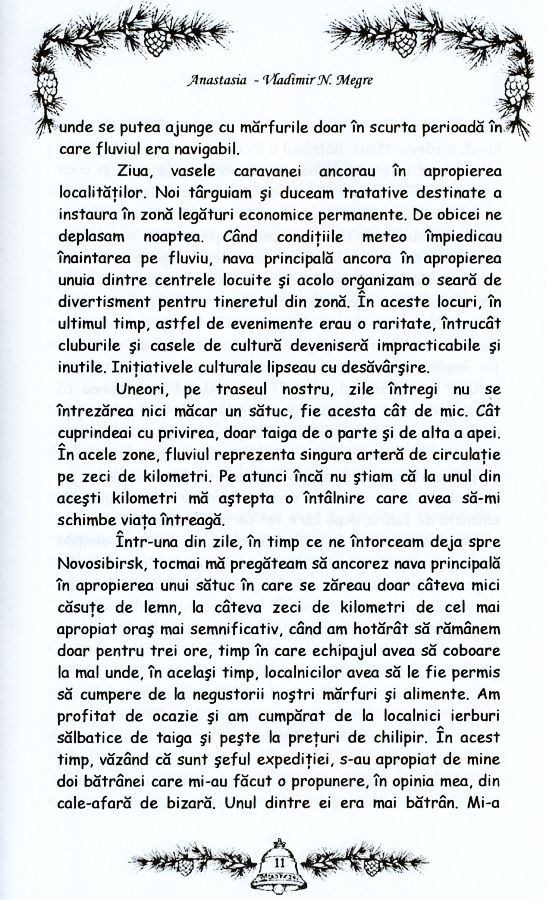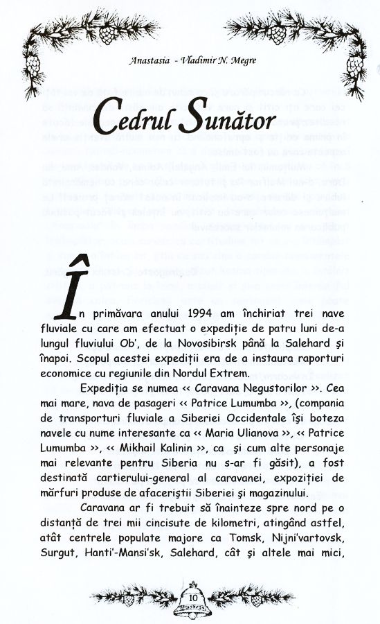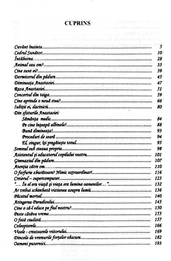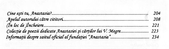 | Cunoscutul om de afaceri din Siberia Occidentală, Vladimir Nicolaevici Megre, într-una din expedițiile sale comerciale de-a lungul fluviului Obi, o întâlnește pe Anastasia – această femeie extraordinară – întâlnire care avea să-i schimbe viața radical și pentru totdeauna. Cartea istorisește despre cele trei zile petrecute de autor în taigaua siberiană în compania Anastasiei. |