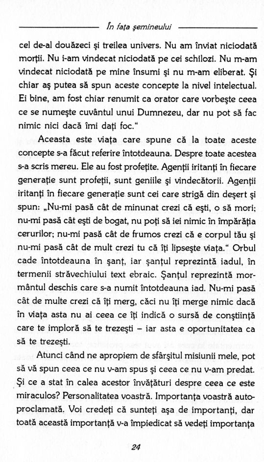 „Dacă nu vă învață nimeni niciodată să visați visul nelimitat, dacă nu vă învață nimeni niciodată să inhalați respirația nărilor lui Dumnezeu, primăvara, și dacă nimeni nu vă învață să vă uitați la cerul de la miezul nopții și să contemplati conceptele veșniciei, atunci veți fi veșnic separați de Dumnezeu, de împărăția lui naturală, de frumusețea lui strălucită, de magia și încântarea lui îmbătătoare. N-o să-l cunoasteti: niciodată. Trebuie să învățați că asta este natura adevărată a ființei voastre și când învățați asta, veți ști că Domnul Dumnezeu al ființei voastre nu încearcă să vă îndepărteze de la viată, ci să vă trezească în miezul ei. Nu se luptă pentru limitarea sa, ci străpunge prin pereții care vă împiedică exprimarea.”