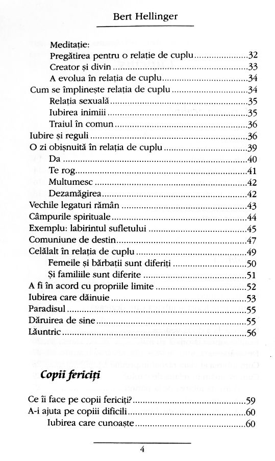 Mici povești de viață, transcrieri din seminarii de constelații familiale sunt utilizate pentru a descrie și a demonstra ceea ce autorul numește "Legile iubirii", și modul cum perturbările acestor legi într-o generație, creează "moșteniri" pe care generațiile următoare trebuie să le poarte. Autorul a descoperit că iubirea singură nu este suficientă. Pentru ca iubirea să înflorească într-o familie ea trebuie însoțită de adevăr și are nevoie de ordine.
