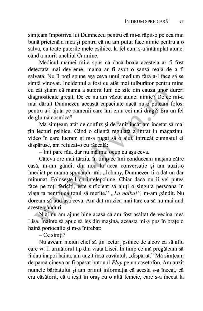 Aceasta este povestea remarcabilă a vieții mediumului John Edward și a celor mai interesante lecturi pe care le-a ținut vreodată. Cartea descrie felul în care aceste lecturi psihice i-au ajutat pe oameni să își depășească durerea și să își continue viața, fără a înceta vreodată să îi iubească pe cei decedați, a căror viață nu a încetat, ci doar s-a transformat…
