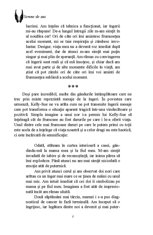 În cartea Semne de sus, Doreen Virtue și fiul ei Charles te învață cum poți înțelege aceste semne, care te înconjoară de pretutindeni. Citind poveștile adevărate ale celor care s-au rugat la îngeri și care au primit semne clare ca răspuns la rugăciunile lor, te vei simți la rândul tău reconfortat și mângâiat. În plus, vei înțelege mai bine ce trebuie să faci pentru a le cere îngerilor astfel de semne și cum trebuie să te rogi pentru sănătate, relația de cuplu, carieră și alte domenii ale vieții.
