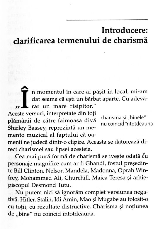 Autorul demonstrează, contrazicând așteptările noastre, că și charisma se învață. Putem dezvolta propria paletă de abilități de impact și relaționare, așa încât pe calea charismei să ne îmbunătățim toate aspectele vieții noastre.