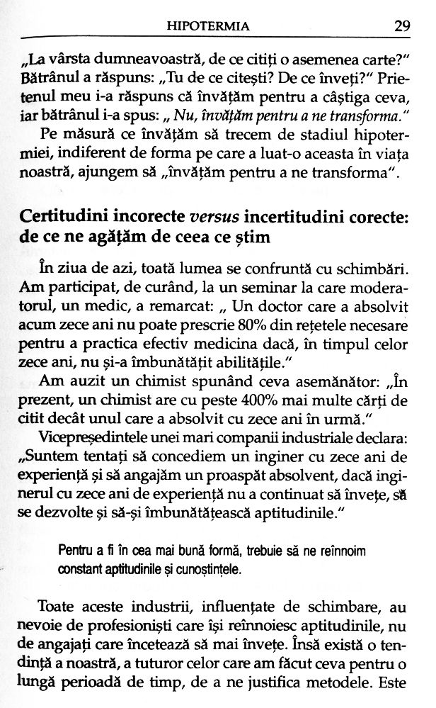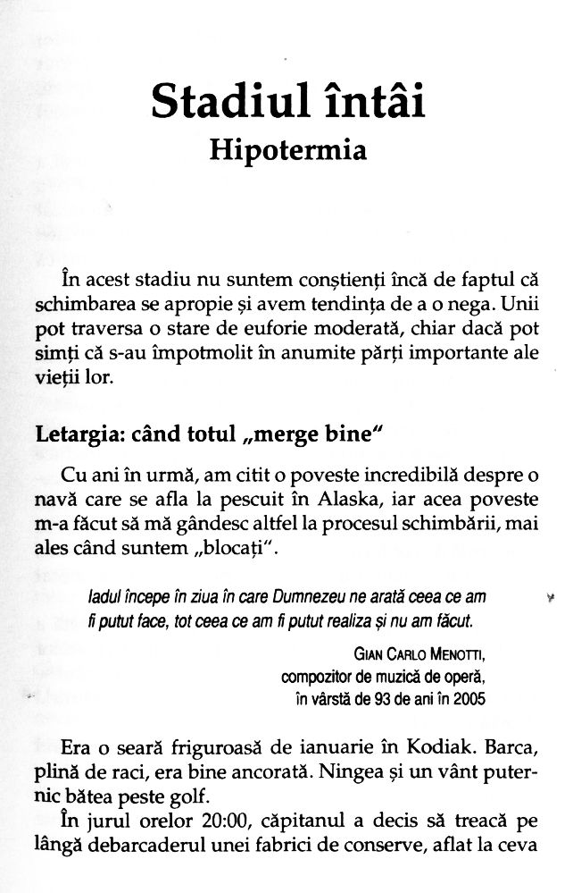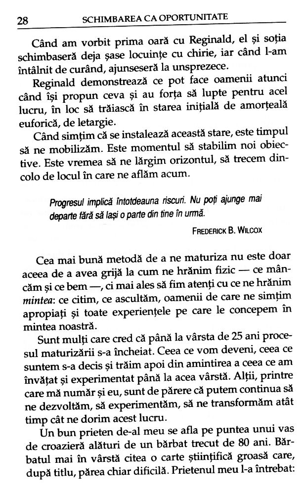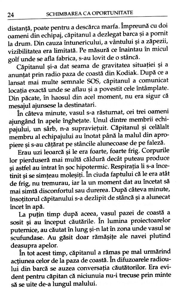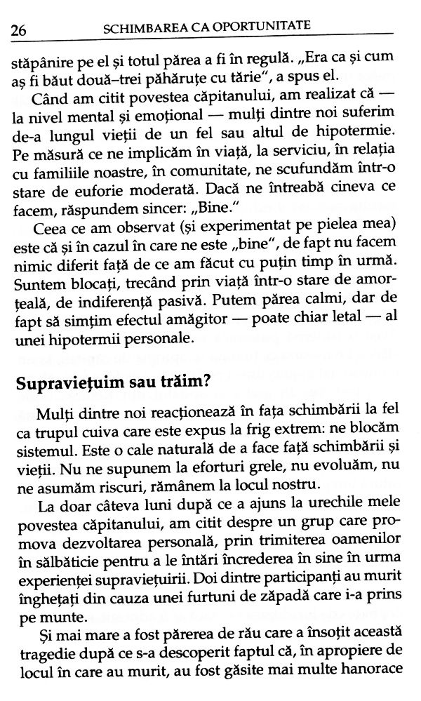 | Departe de a fi un compendiu sec care analizează punctual etapele managementului schimbării, Schimbarea ca oportunitate ne oferă exemple concrete prin care Ralph Bruksos ne demonstrează convingător că schimbarea de orice fel are întotdeauna o latură pozitivă, iar dezvoltarea personală și succesul nu pot surveni în lipsa unor puncte de cotitură în viața personală și în cea profesională. |