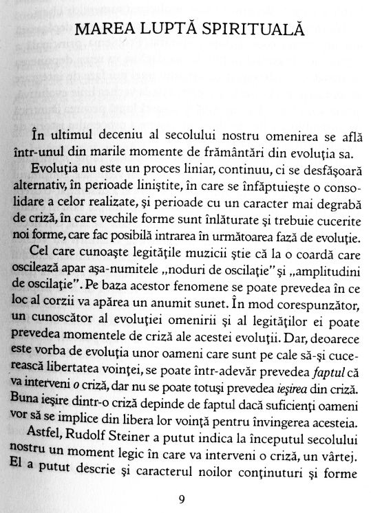 Începând din toamna anului 1989 aceasta începe să se reveleze cu toată limpezimea. Marea luptă spirituală este în plină desfășurare, iar succesul strădaniilor înnoitoare care au apărut acum este încă nedecis. Tocmai acum se pune problema de a dezvolta, pe lângă o bunăvoință, și capacitățile de cunoaștere corespunzătoare. În acest context este necesar să dobândim claritate în privința fundamentelor spirituale ale situației mondiale.