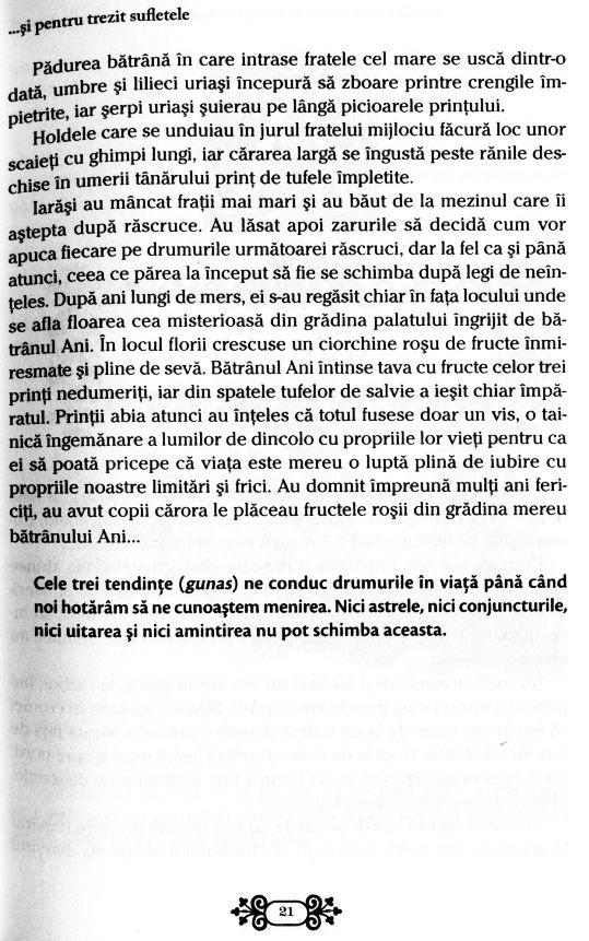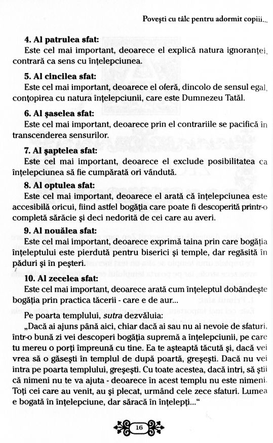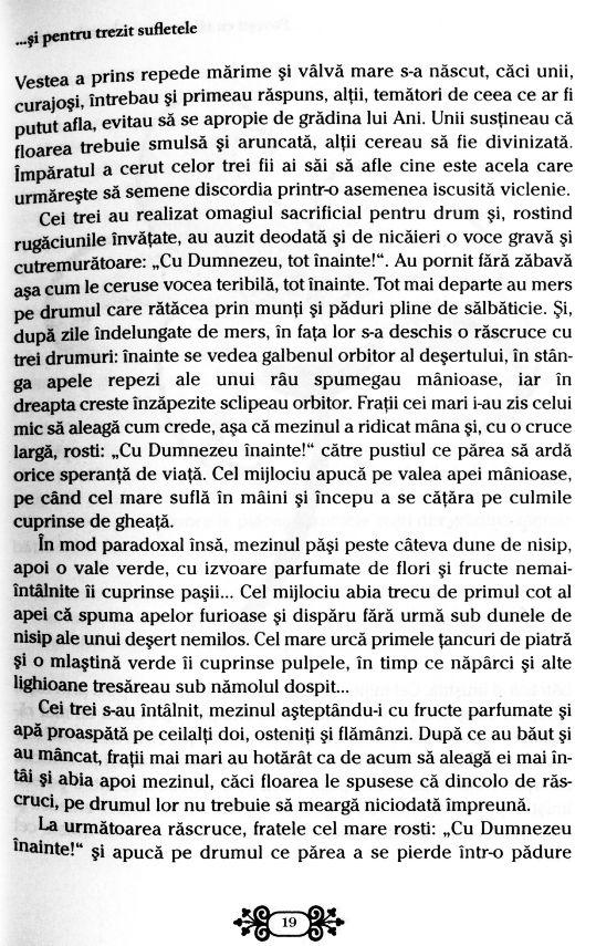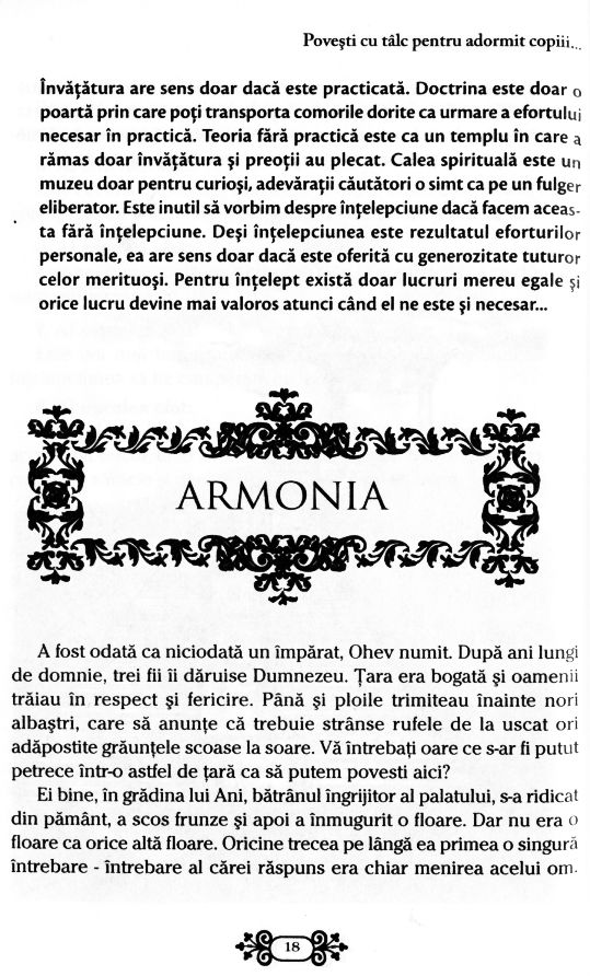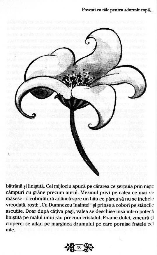| Povestea a fot și rămâne calea tainică a unei magice dezvăluiri pe care altminteri cotidianul o acoperă așa cum cortina din pluș acoperă actul final al unei piese de teatru. Așa cum copiii sunt cuprinși de bucuria somnului liniștit, adolescenții și cei maturi extrag învățămintele necesare din poveștile bătrânilor. |