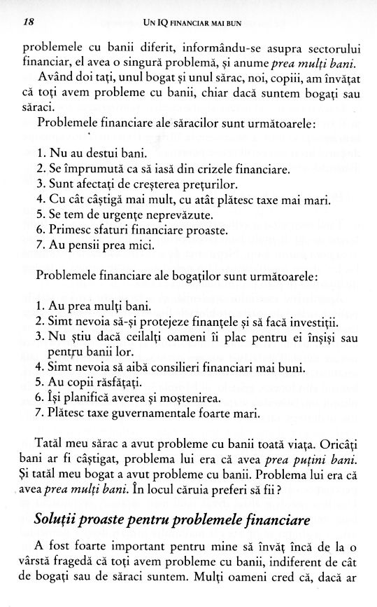 Ce înseamnă să fii inteligent în plan financiar Când aveam cinci ani, am fost dus repede la spital ca să fiu operat de urgență. Din câte am înțeles, aveam o infecție gravă la ureche, o complicație de la vărsatul de vânt de care mă îmbolnăvisem. Deși a fost o experiență înfricoșătoare, îmi amintesc cu drag că, atunci când am stat în pat, revenindu-;mi după intervenție, tatăl meu, fratele meu mai mic și cele două surori ale mele stăteau pe peluza din fața spitalului și-;mi făceau cu mâna. Mama nu era acolo. Era acasă, țintuită la pat, pentru că suferea de inimă. La mai puțin de un an după aceea, fratele meu mai mic a fost dus la spital după ce a căzut în cap de pe o rampă din garaj. Apoi i-;a venit rândul surorii mele mai mici. A avut nevoie de o operație la genunchi. Ș;i sora mea cea mai mică, Beth, a avut încă de la naștere o afecțiune gravă a pielii, care i-;a pus încontinuu în încurcătură pe doctori. A fost un an greu pentru tatăl meu. El a fost singurul dintre noi șase care nu a avut probleme de sănătate. Vestea bună este că ne-;am însănătoșit cu toții și sănătoși am rămas. Vestea proastă a fost că facturile medicale veneau una după alta. Tatăl meu nu a fost bolnav în acel an, dar a contractat o „maladie“ împovărătoare – datoriile copleșitoare pentru serviciile medicale. În acel moment, tatăl meu era absolvent al Universității din Hawaii. A fost un student eminent și și-;a obținut diploma de licență în doar doi ani. Tata visa să devină profesor universitar într-;o bună zi. Însă, văzându-;se cu o familie cu șase membri, cu o ipotecă și facturi medicale mari de plătit, a renunțat la visul lui și și-;a găsit o slujbă ca asistent superintendent al școlilor dintr-;un orășel mic, Hilo, din insula Hawaii. Ca să-;și permită să se mute împreună cu familia de pe o insulă pe alta, tata a trebuit să se împrumute de la tatăl lui. A fost o perioadă dificilă pentru el și pentru noi toți. Deși a avut un succes profesional extraordinar și, în cele din urmă, a terminat și doctoratul, presupun că faptul că nu și-;a împlinit visul de a deveni profesor universitar l-;a bântuit pe tatăl meu până la sfârșitul vieții. El ne spunea adesea: „Dragii mei, când fiecare dintre voi o să plece la casa lui, eu o să mă întorc la școală și o să fac ceea ce-;mi place, adică o să predau.“ Totuși, în loc să predea, el a ocupat, în cele din urmă, un post administrativ, de superintendent educațional în statul Hawaii, apoi a candidat pentru poziția de locotenent-;guvernator, dar fără succes. La 50 de ani, s-;a văzut brusc șomer. La puțin timp după alegeri, mama a murit pe neașteptate, la 48 de ani, din cauza problemelor de inimă. Tata nu și-;a revenit niciodată după aceea. Din nou, s-;a văzut împovărat de probleme financiare. Neavând o slujbă, tata a hotărât să-;și retragă economiile pentru pensie și a investit într-;o franciză națională de înghețată. A pierdut toți banii. Pe măsură ce îmbătrânea, tata simțea că toată lumea de vârsta lui îl depășise; cariera lui se încheiase. Își pierduse identitatea odată cu slujba de șef pe probleme de educație. A devenit din ce în ce mai furios pe colegii lui bogați care, deși nu erau la fel de educați ca el, își întocmiseră câte-;o afacere proprie. Pufnind și trăsnind, tata ne spunea adesea: „Mi-;am dedicat viața educației copiilor din Hawaii și ce primesc în schimb? Nimic. Colegii mei se îmbogățesc tot mai mult pe zi ce trece și eu ce primesc? Nimic.“ N-;o să știu niciodată de ce nu s-;a întors tata la universitate să predea. Cred că se străduia foarte mult să se îmbogățească repede și să recupereze timpul pierdut. Alerga tot timpul, fiind ocupat cu tot felul de afaceri dubioase, și pierdea multă vreme în compania unor escroci vorbăreți. Niciuna dintre afacerile lui riscante din care trebuia să se îmbogățească nu a mers. Dacă nu ar fi fost câteva slujbe ciudate și asigurarea socială, el ar fi trebuit să se mute cu unul dintre noi, copiii lui. Cu câteva luni înainte să moară de cancer, la 72 de ani, tata m-;a tras aproape de patul lui și și-;a cerut scuze pentru că nu prea avea ce să ne lase. Ținându-;ne de mână, am izbucnit amândoi în plâns. Prea puțini bani Tatăl meu sărac a avut probleme cu banii toată viața lui. Indiferent de cât de mulți bani făcea, problema lui era una și aceeași: avea prea puțini bani. Neputința de a rezolva această problemă l-;a îndurerat întotdeauna. Din nefericire, nu se simțea suficient de bun nici în plan profesional, nici ca tată. Aparținând mediului academic, el a făcut tot ce i-;a stat în putință să lase deoparte problemele financiare și să-;și dedice viața unei cauze mai nobile decât banii. Ne spunea mereu că în viață nu contează banii. Afirma acest lucru chiar și atunci când avea mare nevoie de ei. Tata a fost un om extraordinar, un soț și un tată minunat și un profesor excelent; totuși, de cele mai multe ori, banii îl conduceau, grija lor îl bântuia în tăcere și, din păcate, în ultimii ani, își evalua viața în funcție de ei. În ciuda faptului că era foarte deștept, tata nu și-;a rezolvat niciodată problema cu banii. Prea mulți bani Tatăl meu bogat, care a început să-;mi vorbească despre bani pe vremea când aveam nouă ani, avea, și el, probleme cu banii. Dar le-;a rezolvat altfel decât tatăl meu sărac. A recunoscut că banii nu contează în viață, și tocmai pentru că și-;a dat seama de asta, s-;a zbătut să învețe cât mai multe lucruri despre domeniul financiar. Pentru el, asta însemna să-;și înfrunte dificultățile financiare și să învețe din ele. Tatăl meu bogat nu era nici pe departe atât de educat ca tatăl meu sărac. Pentru că a abordat problemele cu banii diferit, inf