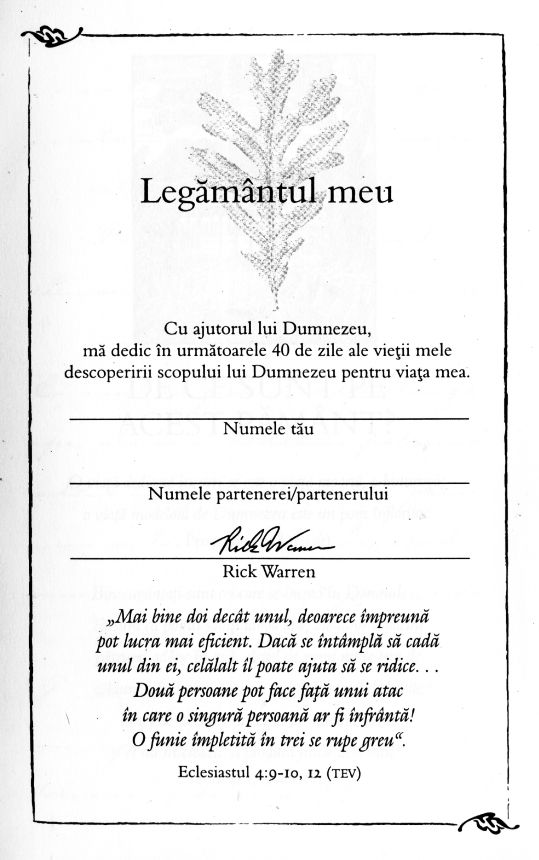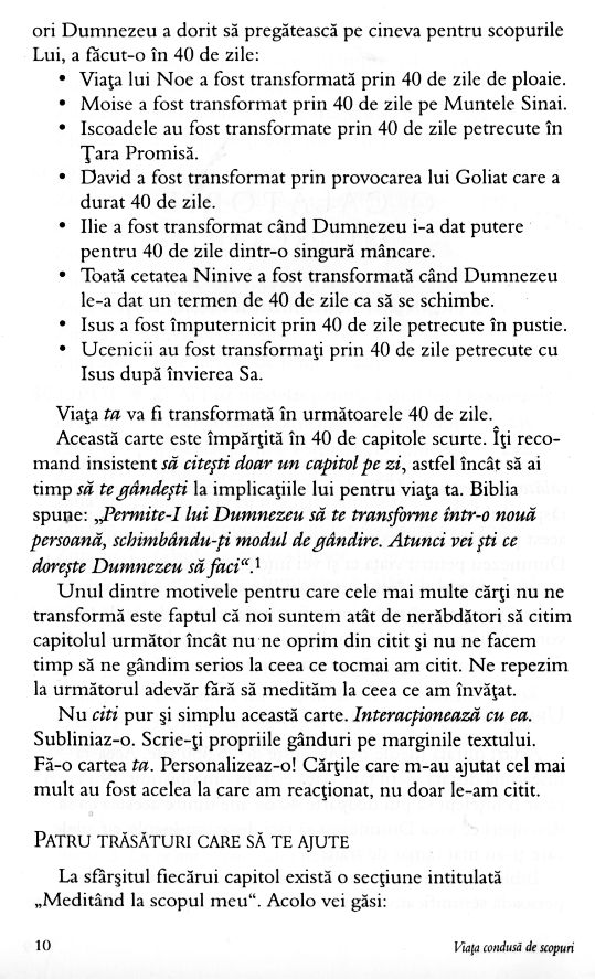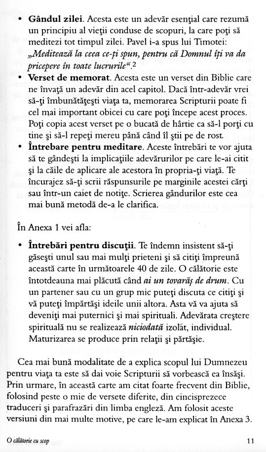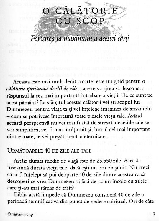 „Ești dezorientat în ce privește direcția ta în viață? Există decizii dificile pe care trebuie să le iei și pași greu de făcut? Dacă da, Rick Warren a scris pentru tine o capodoperă de sfaturi înțelepte. Indiferent dacă ești un căutător al adevărului, un nou convertit sau un sfânt cu experiență, lasă-L pe Dumnezeu să folosească aceste pagini ca să-ți așeze ferm picioarele pe calea cea dreaptă!”