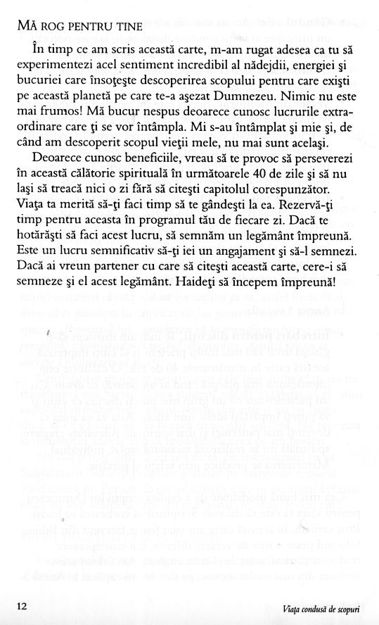 „Dacă citești doar o carte despre esența vieții – citește-o pe asta!Această carte schimbă vieți. Rick Warren este extraordinar în explicarea adevăratului nostru scop pe pământ și în exprimarea adevărurilor profunde în moduri simple. Oferă această carte tuturor persoanelor de care îți pasă.Crede-mă că nu vei mai fi niciodată același după ce o vei citi!Ce dar extraordinar!”