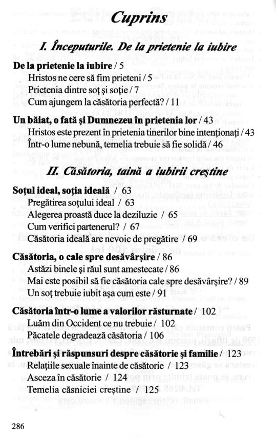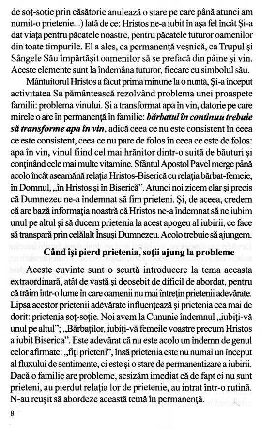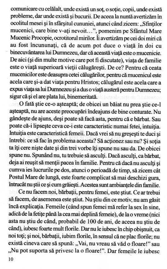 Soțul ideal știe să mențină în căsnicie acel suflu, acel elan al primei zile de prietenie. El știe să se roage, să admire, să facă observații într-un anume fel și are multe alte calități. Soția ideală este aceea care înțelege tot. Dacă înțelege tot, ea dă dovadă de bunătate, și din bunătatea inimii decurg toate. E foarte simplu să devii soție ideală. Este așa de simplu, numai că trebuie atenție și pregătire!