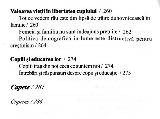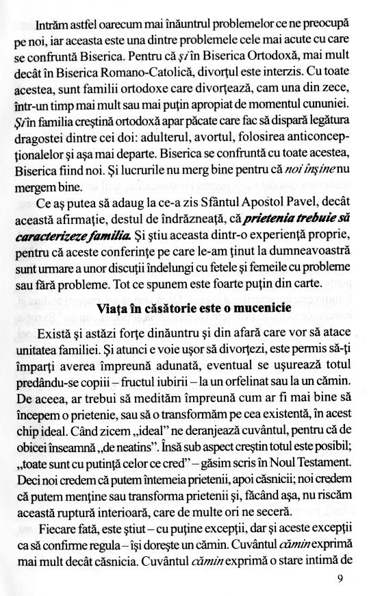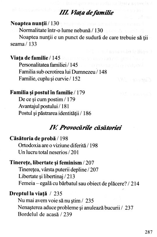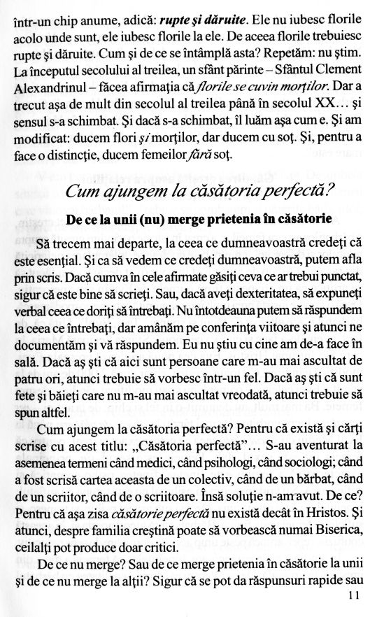 Soțul ideal... are un timp mai îndelungat de pregătire; la fel și soția ideală. Fiecare se pregătește de la naștere și dinainte de naștere! […] Căsnicia este o clădire care se construiește pe o temelie, iar astăzi temelia este pusă prost. […] Căsnicia este o lucrare, iar dacă nu înțelegem acest aspect, atunci ajungem la despărțire.