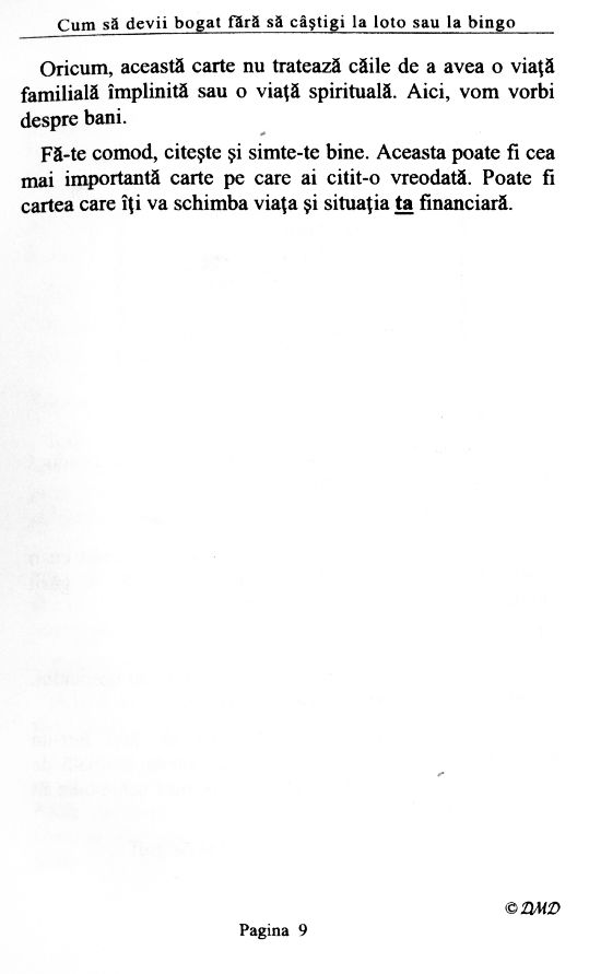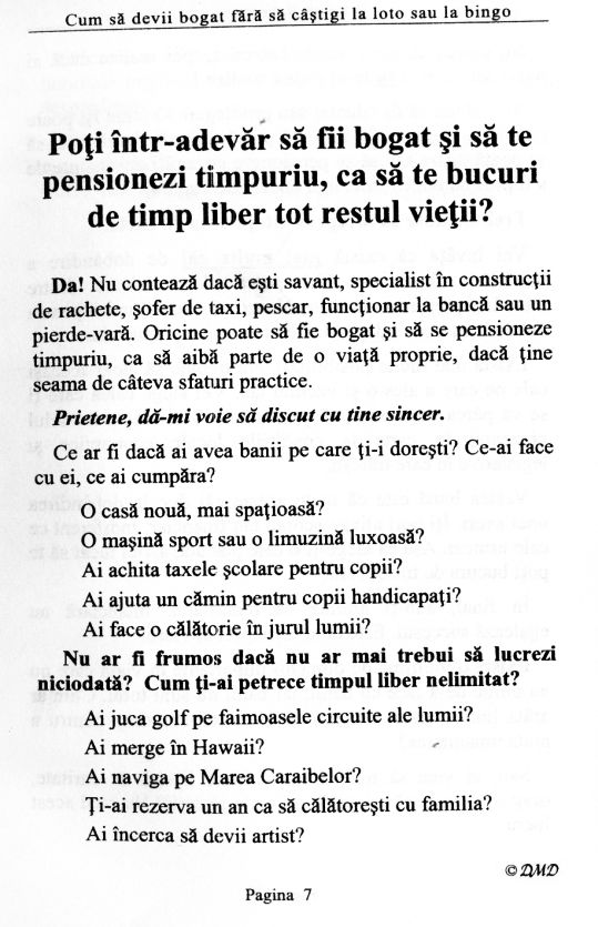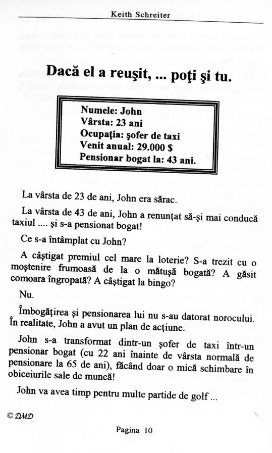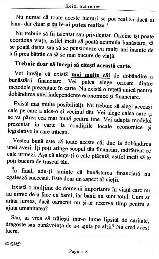 Nu numai că toate aceste lucruri se pot realiza dacă ai bani – dar chiar și tu le-ai putea realiza! Nu trebuie să fii talentat sau privilegiat. Oricine își poate coordona viața, astfel încât să poată acumula bunăstare, să se poată distra sau să se pensioneze cu mulți ani înainte de a fi prea bătrân ca să se mai bucure de viață. Trebuie doar să începi să citești această carte.