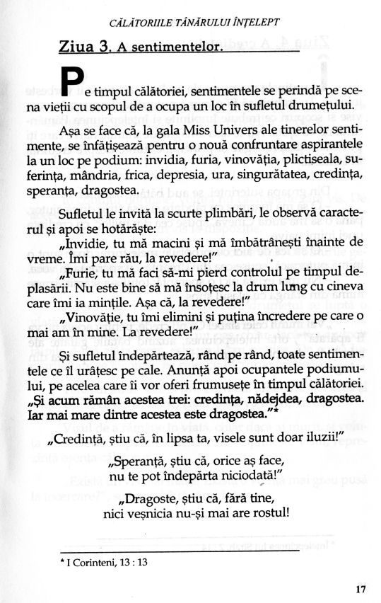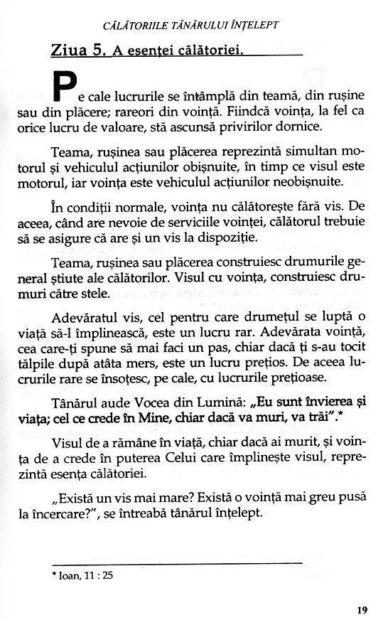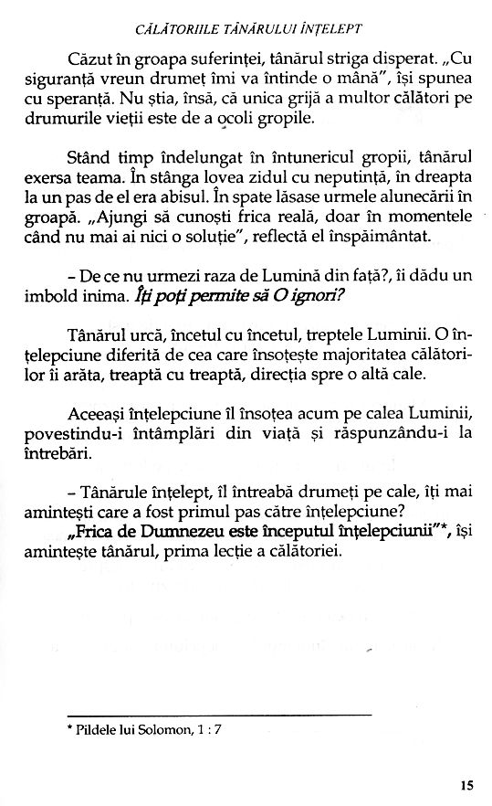Marile principii spirituale ale existenței, marile secrete ale lumii sufletului sunt dezvăluite călătorului care caută și cere și, nu în ultimul rând, călătorului care știe să asculte. Fie să putem asculta și noi șoaptele profunde ale înțelepciunii ce ni se dezvăluie prin cărți, precum Cătoriile tânărului înțelept, prin cei dragi, prin cei ce nu ne sunt dragi, prin obiectele ce ne înconjoară și prin tot ce este în lumea noastră interioară. Căci toate ne vorbesc și toate sunt pline de înțelepciune, toate conțin indicii care ne poartă pașii pe cale.