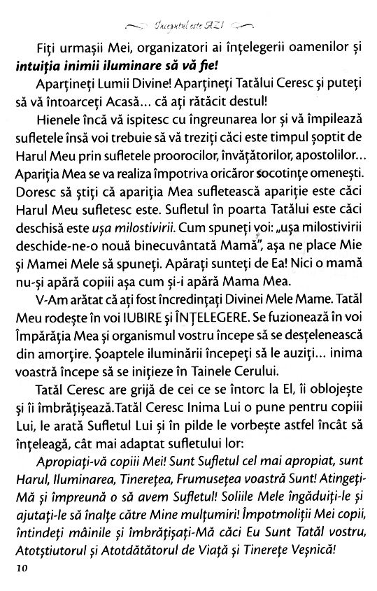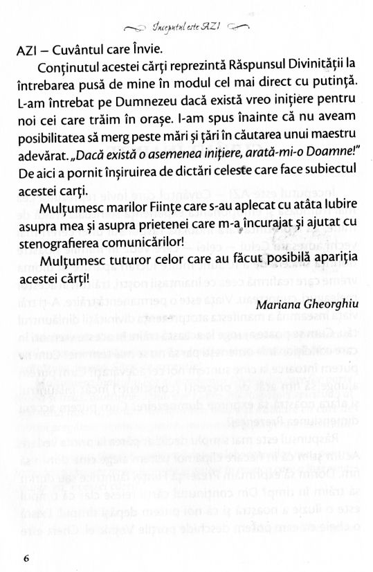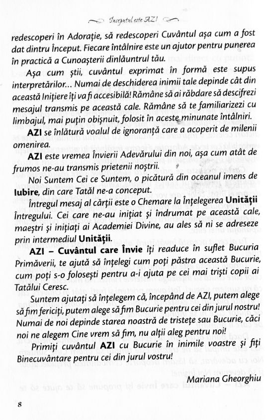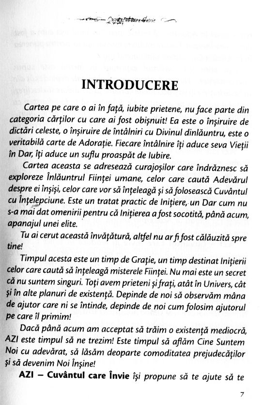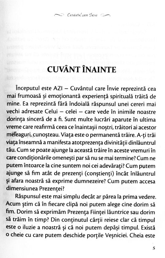 | Viața este o permanentă trăire. A-ți trăi viața înseamnă a manifesta atotprezența divinității dinlăuntrul tău. Cum se poate ajunge la această trăire în aceste vremuri în care condiționările omenești par să nu se mai termine? Cum ne putem întoarce la cine suntem noi cei adevărați? Cum putem ajunge să fim atât de prezenți (conștienți) încât înlăuntrul și afara noastră să exprime dumnezeire? |