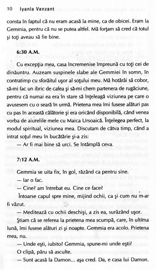 Am să vă spun povestea unui autor bine vândut de la New York Times, ajuns falit, fără locuință. Am să vă arăt cum se termină o relație de 37 de ani cu un divorț prin e-mail. Am să împărtășesc cu dumneavoastră detalii intime despre cum un învățător spiritual recunoscut pe plan internațional stărșește pe marginea unui pat dintr-o casă de un milion de dolari, ipotecată, reflectând la sinucidere. Am să vă spun și despre forța prietenilor, a credinței și a rugăciunii. Îmi doresc să împărtășesc cu dumneavoastră ce-am aflat despre a avea sau nu o viziune și cât de scump plătești dacă te agăți de una care nu-ți aparține. E dureros și să te uiți la cum se spulberă o viață, darămite să treci prin asta. Și mai devastator e că, pe măsură ce existența ta ]ncepe să se depene zi după zi, crâmpei după crâmpei, nu mai poți face absolut nimic ca s-o oprești.