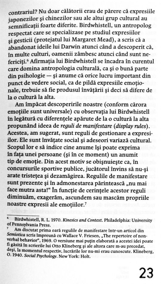 Vreți să aflați prin ce diferă un zâmbet fericit de un surâs forțat? Doriți să simțiți ce sentimente ascunde copilul, partenerul sau șeful dumneavoastră? După decenii de cercetări ale emoțiilor și expresiilor faciale, Paul Ekman și-a sintetizat rezultatele în această carte, care combină excelent informațiile științifice cu sugestiile practice.