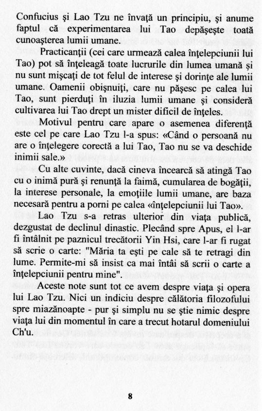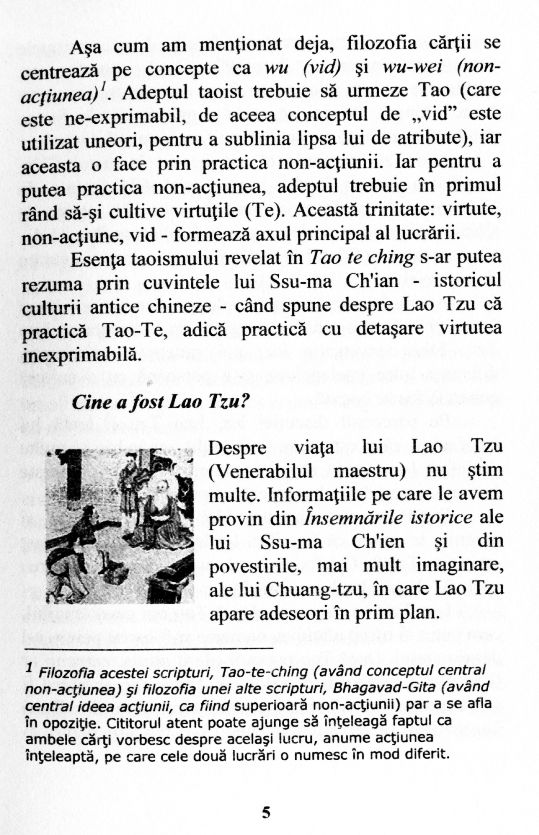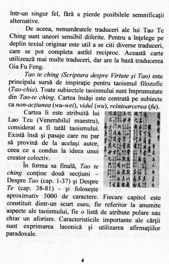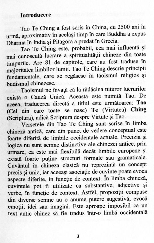 Tao Te Ching este, probabil, cea mai influentă și mai cunoscută lucrare a spiritualității chineze din toate timpurile. Are 81 de capitole, care au fost traduse în majoritatea limbilor lumii. Tao Te Ching descrie principii fundamentale, care se regăsesc în taoismul religios și budismul chinezesc.