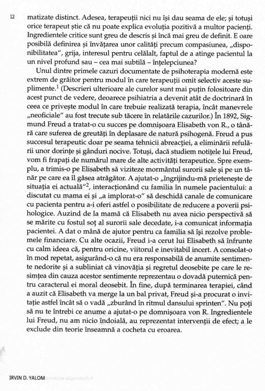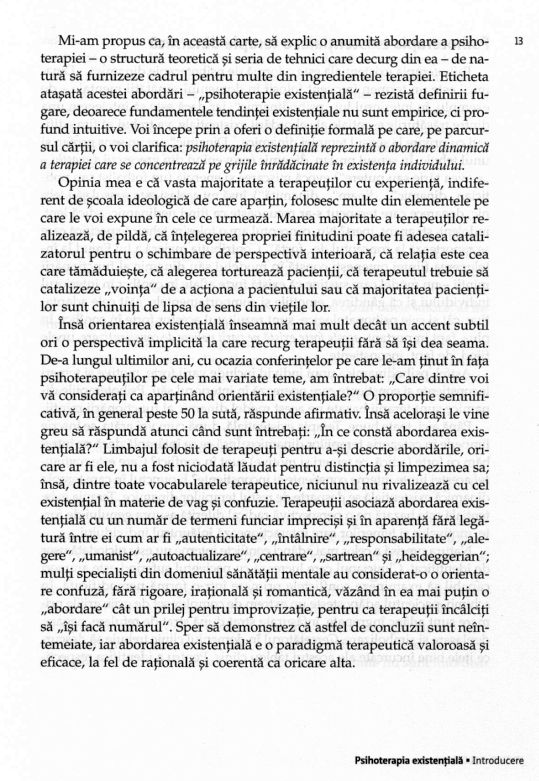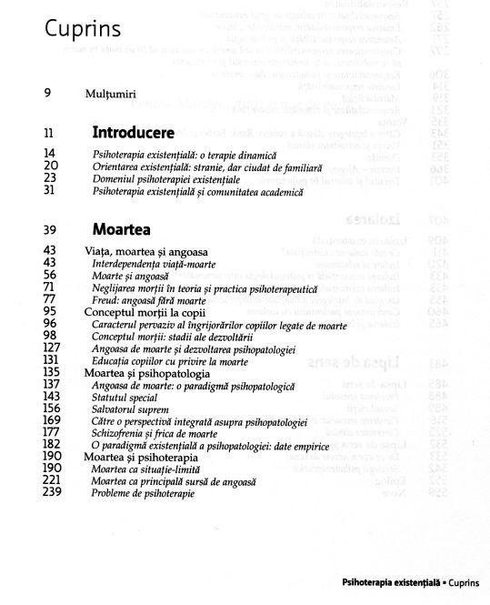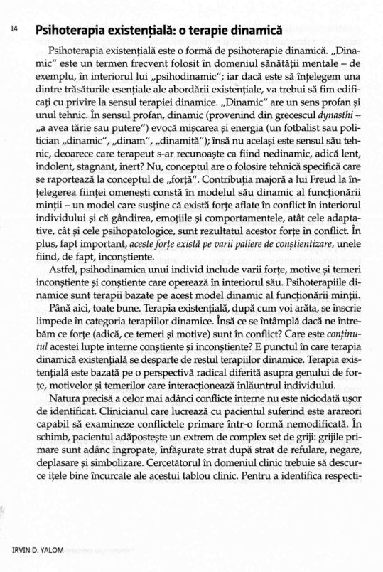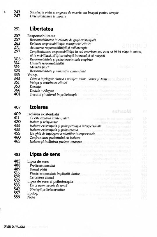 | Cele patru „griji fundamentale ale omului” – moartea, libertatea, izolarea existențială și lipsa de sens – se află în centrul psihoterapiei existențiale care a fost și continuă să fie practicată în multe forme și în multe situații, pe tot globul. În acest tratat, Irvin Yalom examinează semnificația fiecărei griji existențiale și tipurile de conflict care iau naștere din întâlnirea omului cu ele. |