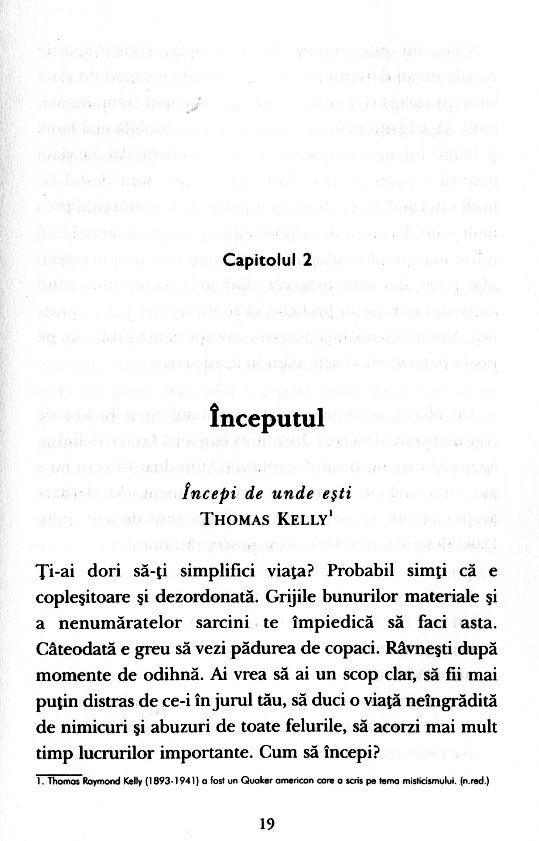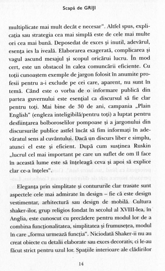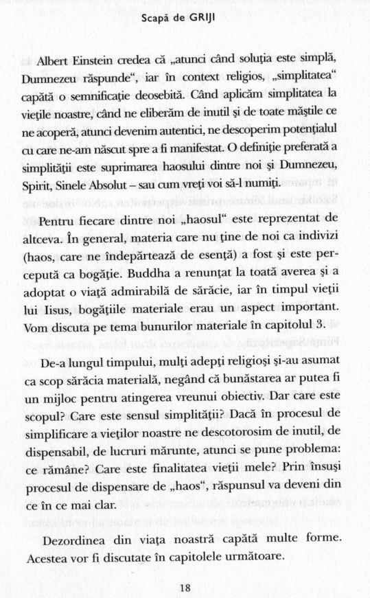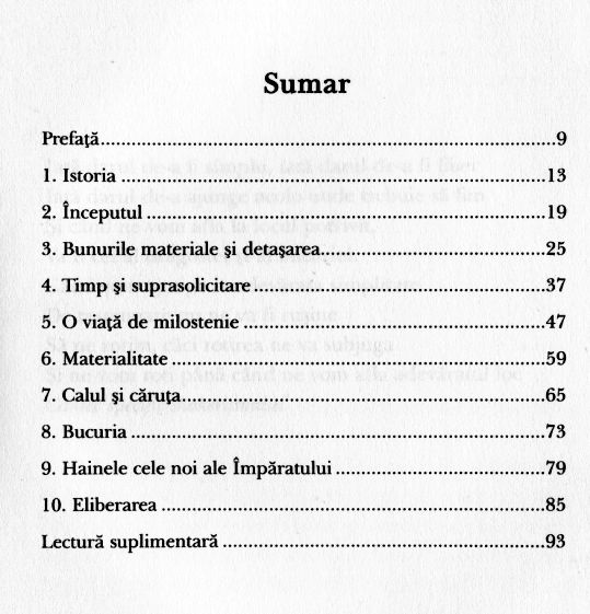 Autoarea explică, într-un limbaj accesibil, cum să scapi de griji adoptând un stil de viață mai simplu și mai adaptat la cerințele moderne, cum să te scuturi de greutatea excesivă a lucrurilor care nu-ți sunt necesare, și mai ales de unde provine și cum a fost privită această idee de-a lungul vremii.