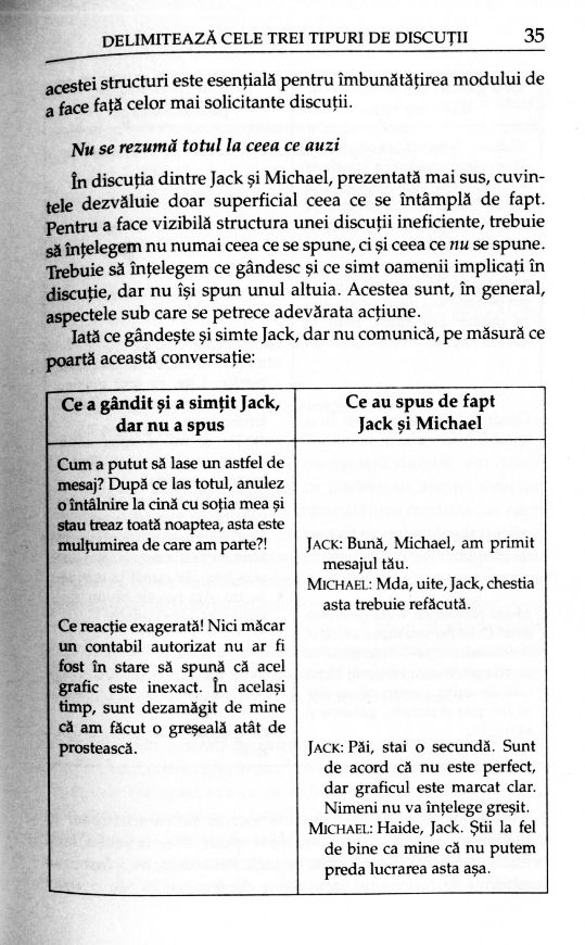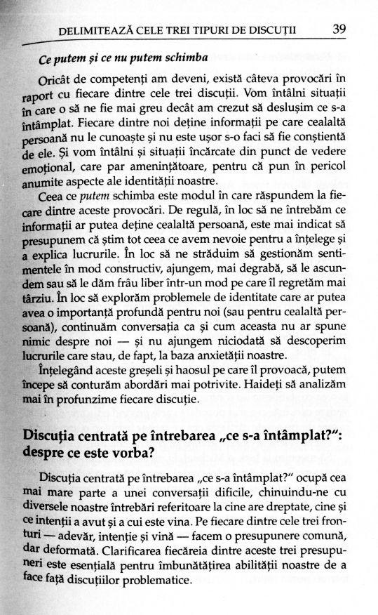Fiecare interacțiune verbală defectuoasă este alcătuită, de fapt, din trei discuții: una centrată pe întrebarea „ce s-a întâmplat?“, alta pe sentimente și o a treia axată pe identitate. Prima discuție are în centru dezacordul părților cu privire la cele întâmplate între ei și problema vinovatului. A doua discuție se referă la sentimentele pe care le au interlocutorii și la autenticitatea lor. Iar a treia discuție este una interioară, pe care o purtăm în sinea noastră, încercând să înțelegem cum ne transformăm și cum ne purtăm în situația dată.