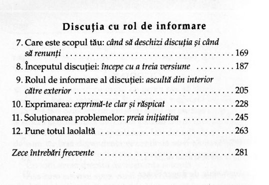 Pentru a reuși să gestionăm o discuție ce pare să nu ducă nicăieri, întrucât ambele părți sunt convinse și preocupate să demonstreze că au dreptate, autorii ne sfătuiesc să-l ascultăm cu atenție pe celălalt, să punem întrebări, să-i cerem cât mai multe detalii concrete și să discutăm deschis. În majoritatea situațiilor, aceste tehnici funcționează. Iar atunci când pare că nu avem șanse să ne înțelegem, e recomandabil să trecem peste episodul respectiv. E o atitudine înțeleaptă.