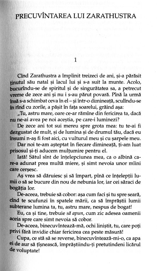 Am început să traduc Also sprach Zarathustra pornind de la o presupunere [...] care pe parcurs s-a confirmat: aceea că mă aflu în fața unui „discurs mixt”, text pe care filozoficul și poeticul și-l dispută în egală măsură.