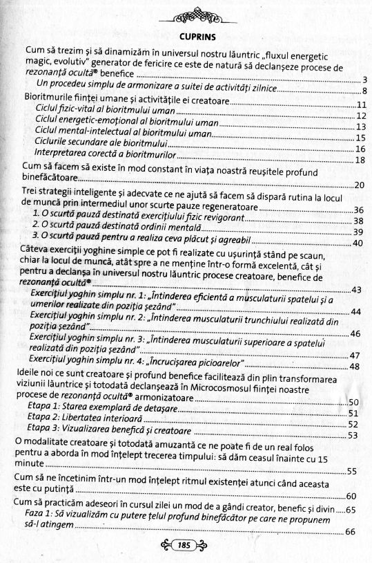 Parcurgând cu atenție lucrarea și urmărind să punem în practică sfaturile oferite, vom putea descoperi că armonizarea vieții implică în realitate atât cunoașterea resorturilor propriei ființe, cât și conștientizarea energiilor subtile cu care interacționăm clipă de clipă. Astfel, este necesar să trăim într-un cât mai deplin acord cu energia timpului și să ne sincronizăm activitatea cu ciclurile vitale, emoționale și intelectuale ale bioritmului uman, să învățăm principiile divine ale succesului și ale reușitei în acțiunile benefice, să receptăm în universul nostru lăuntric energiile creatoare și divin inspirate, să ne lăsăm călăuziți de fluxurile divine magice și inspiratoare care ne pot impulsiona în demersurile noastre binefăcătoare.