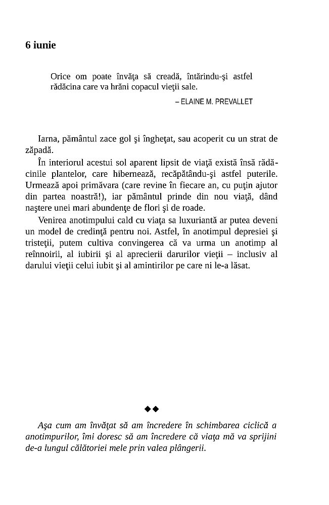 Acest proces continuă foarte mult timp. Dacă persoana care a murit ne-a fost foarte apropiată, el poate dura ani de zile, nu săptămâni sau luni. Unele pierderi – a unui copil sau a partenerului de viață – nu se vindecă” niciodată. Dacă procedăm însă cu înțelepciune și dacă avem curajul de a face ceea ce trebuie, durerea provocată de doliu va începe să își piardă treptat puterea de influență asupra noastră. Noi avem întotdeauna de ales: putem să ieșim din zona de pericol atunci când simțim nevoia, sau putem reveni în ea mai târziu, atunci când ne simțim mai puternici. Putem simți stropii pe față fără teama că ne vom îneca, ba chiar putea savura gustul sării de pe buzele noastre, căci durerea provocată de pierdere vine însoțită de un val de afecțiune pentru persoana care a părăsit această lume, și chiar de senzația că împărtășim același univers, într-o manieră misterioasă, și că suntem uniți în continuare de o iubire care nu poate fi destrămată. |