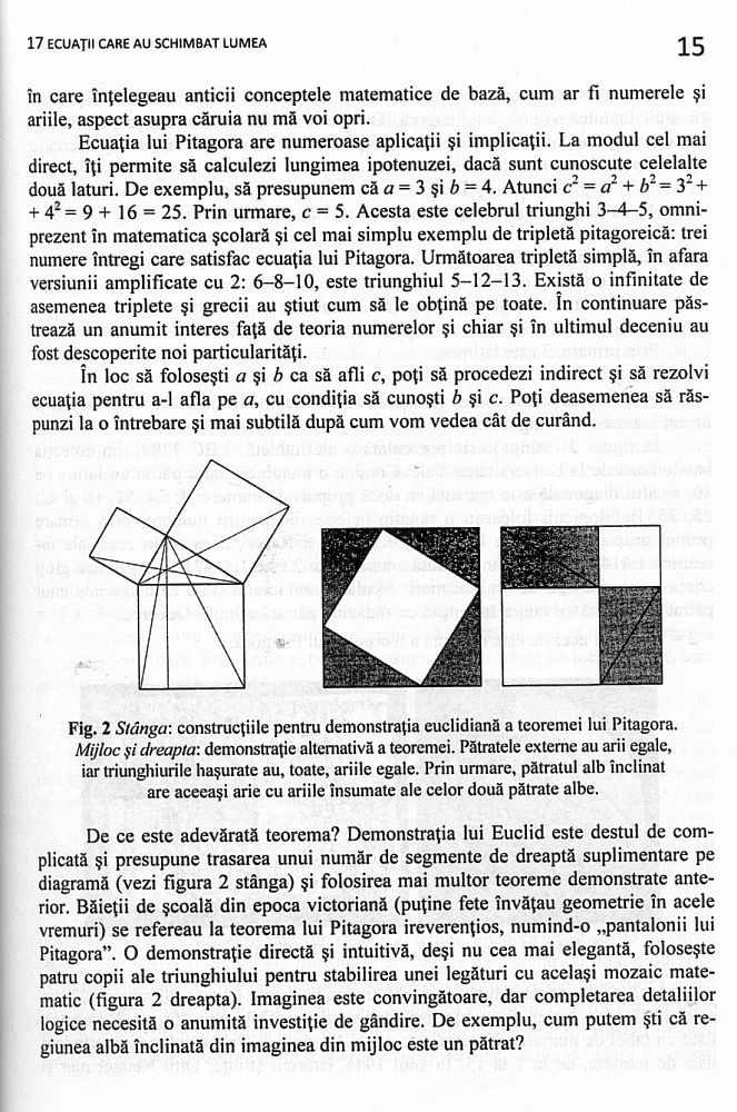 1. Baba călare pe hipopotam / Teorema lui Pitagora ... 12 2. Scurtarea formalităților / Logaritmii ... 29 3. Fantomele cantităților dispărute / Analiză matematică ... 41 4. Sistemul lumii / Legea gravitației a lui Newton ... 57 5. Prevestirea lumii ideale / Rădăcina pătrată a lui minus unu ... 75 6. Mult zgomot pentru noduri / Formula lui Euler pentru poliedre ... 88 7. Modele ale întâmplării / Distribuția normală ... 104 8. Vibrații pozitive / Ecuația undelor ... 124 9. Unde și ecouri / Transformarea Fourier ... 140 10. Ascensiunea umanității / Ecuația Navier-Stokes ... 153 11. Unde în eter / Ecuațiile lui Maxwell ... 164 12. Lege și dezordine / A doua lege a termodinamicii ... 176 13. Un lucru este absolut / Relativitatea ... 194 14. Ciudățenia cuantică / Ecuația lui Schrodinger ... 217 15. Coduri, comunicații și computere / Teoria informației ... 234 16. Dezechilibrul naturii / Teoria haosului ... 250 17. Formula lui Midas / Ecuația Black-Scholes ... 259 Și acum încotro? ... 277