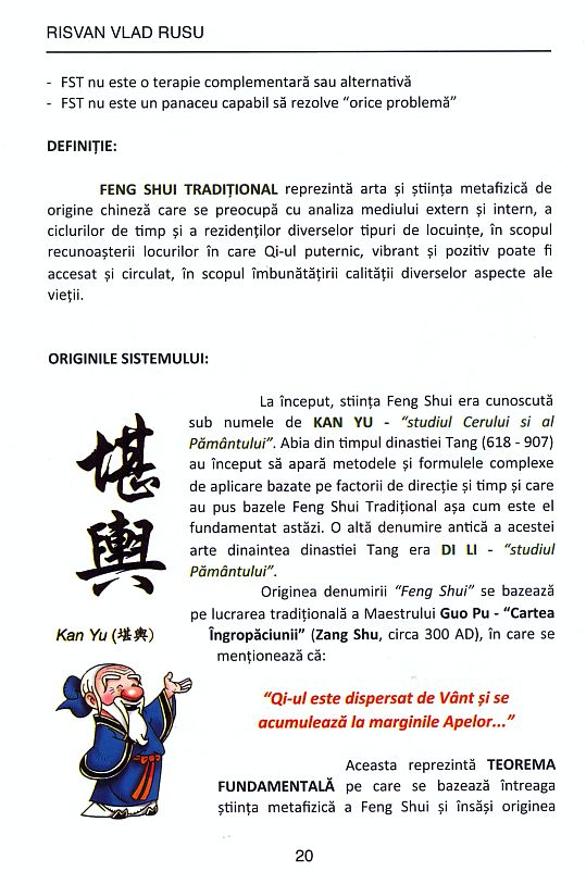 Această lucrare se dorește a fi un manual pentru practicanții Feng Shui tradițional. Deci, dacă vă așteptați să aflați din această lucrare unde să vă poziționați broscuța norocoasă sau care este „colțul universal al bogăției”, veți fi dezamăgiți... Veți avea însă șansa să învățați despre această artă așa cum a fost ea fundamentată de înaintemergătorii înțelepți ai veacurilor dinastice, și până la Maestrul Jiang Da Hong – fondatorul Școlii Stelelor Zburătoare...
